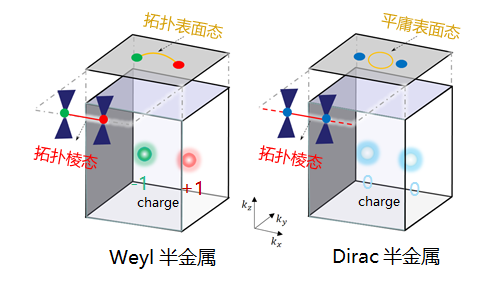 图1. Weyl半金属与Dirac半金属拓扑性质比较。