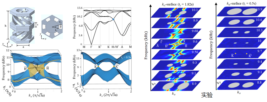 本研究利用了人工声子晶体的可控优势,构建具有相反手性耦合的双层蜂窝晶格(No.184空间群)。其中,一对理想的三维Dirac点受旋转、滑移对称和时间反演对称性保护。通过对比观察侧面和顶面投影的二维表面态,证实了其中不存在“体-面”对应,即只存在平庸的表面态。当界面有缺陷时,平庸的表面态可被彻底移除或消失,除非在表面引入额外对称性,才可能支持一对螺旋状的表面态(图2)。