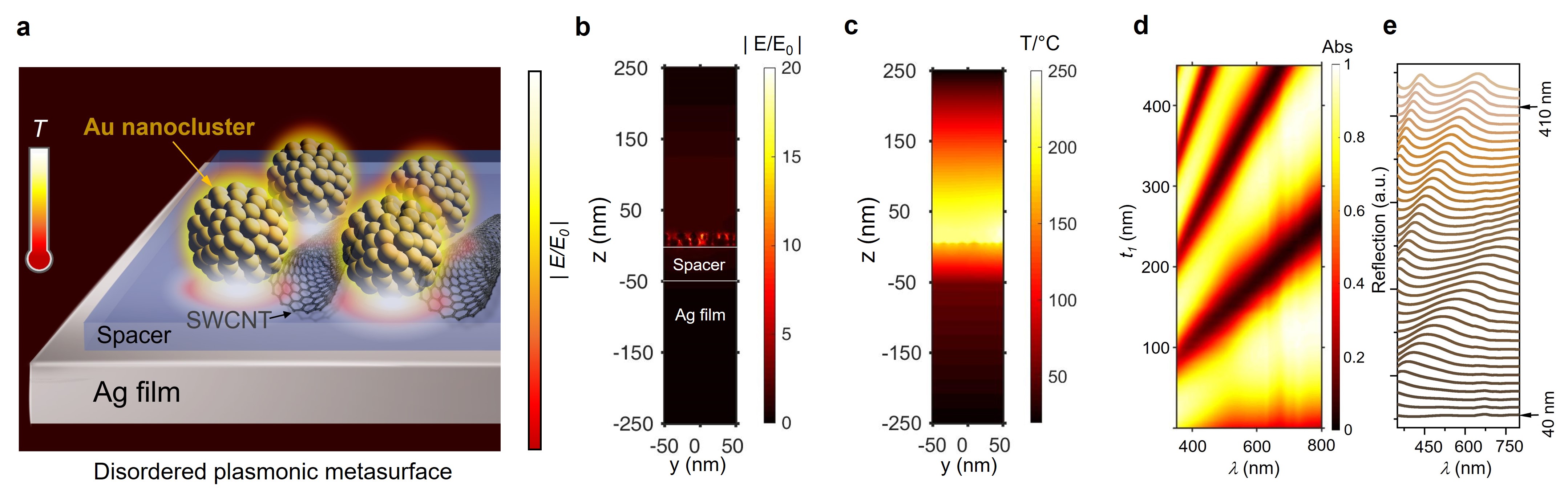 图2.(a)团簇组装等离激元无序超表面;FDTD和FEM模拟的结构内部(b)电场分布:(c)温度场分布;无序超表面光吸收(d)及反射(e)随光学腔厚度(spacer)的变化。