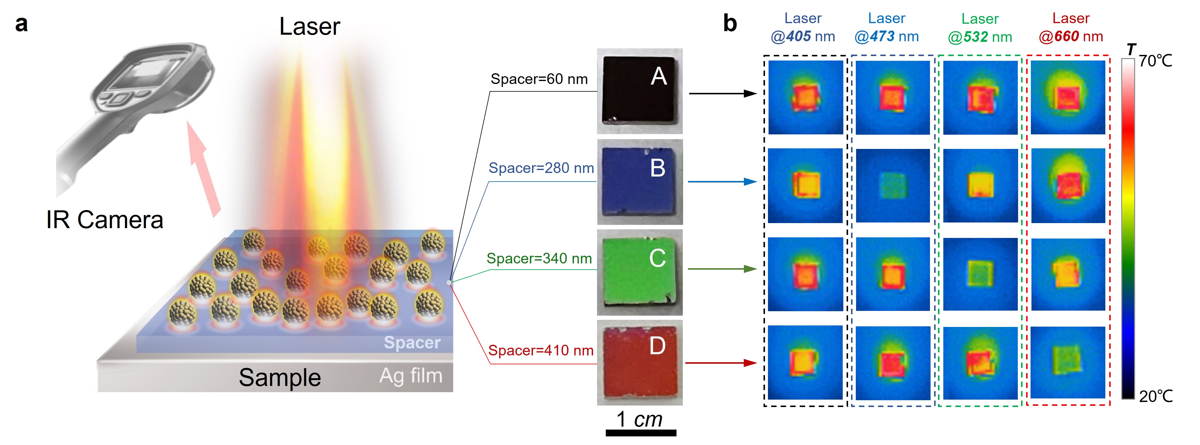 为了展示超表面的宽带吸收与光谱选择性吸收能力及与之对应的光热效应,研究人员分别制备了具有宽带吸收及多种选择性吸收的超表面,并在不同波长光辐照条件下,采集热成像信号,对比信号如图4所示。结果表明,只需调控超表面的单一结构参数,便可实现超表面光吸收及光热转换工作波长范围的连续任意调节。