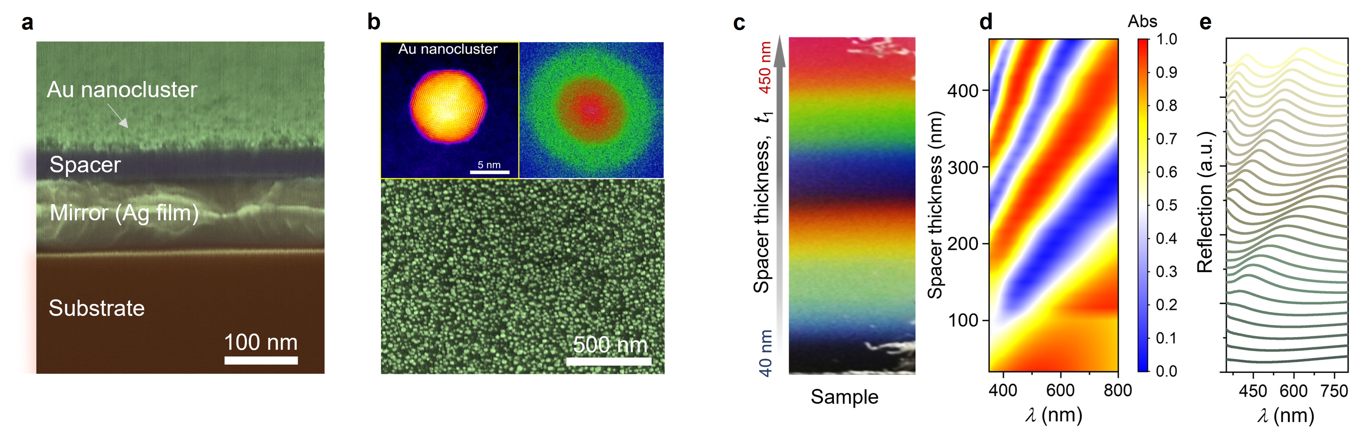 图3.团簇组装无序超表面的SEM截面图((a))及表面形貌(b);当超表面中光学腔参数(spacer 厚度)连续变化时,超表面实际样品照片;对应的吸收(d)及反射(e)光谱。