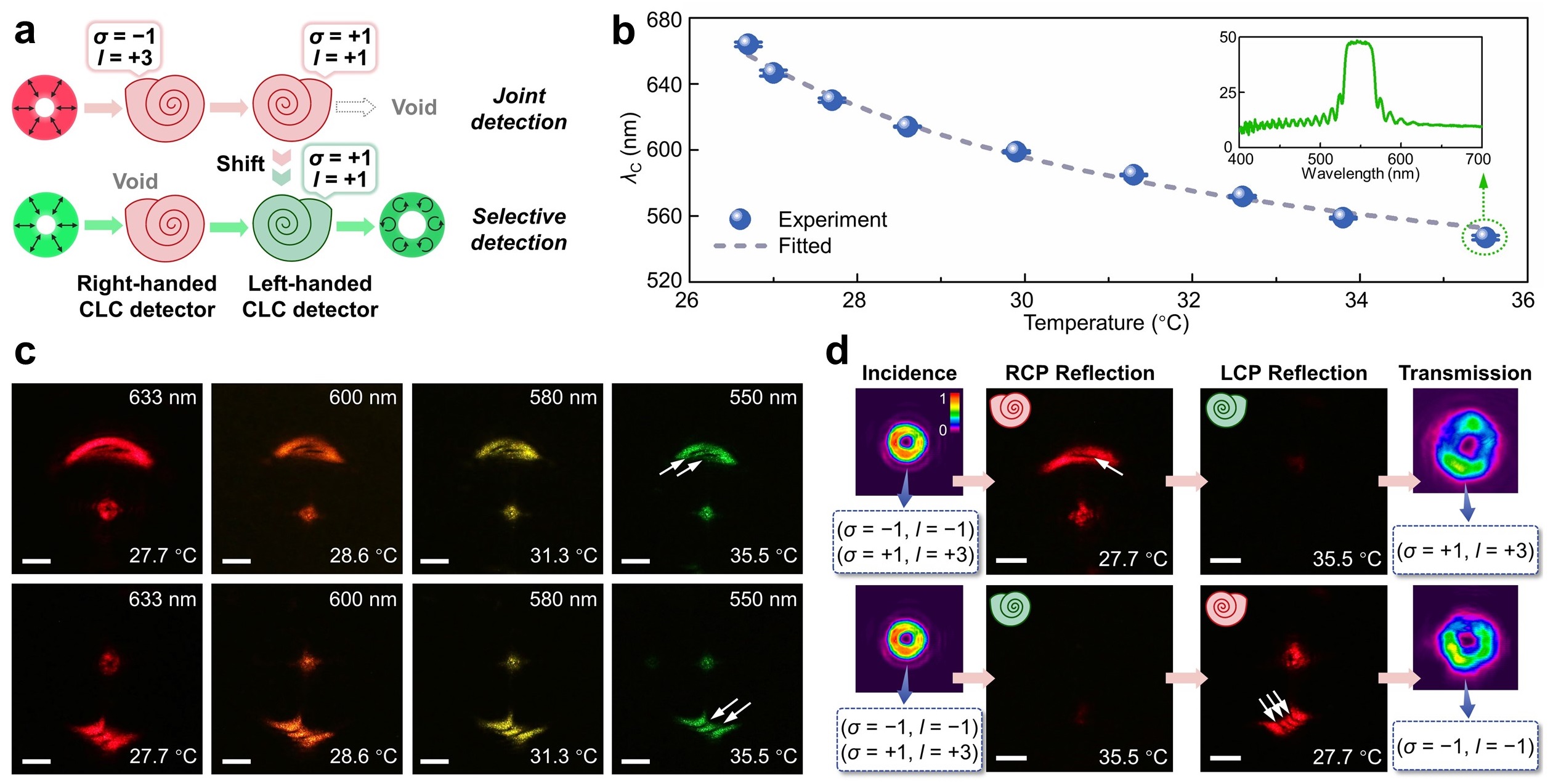 从DNA到甲虫鞘翅,大自然丰富多样的手性结构,为功能材料及器件的设计构筑带来无尽灵感。作为一类典型手性软光子材料,胆甾相液晶(cholesteric liquid crystal, CLC)具有自组装纳米螺旋结构和多元外场响应的手性光子带隙,拓展了光子多维度操控的可能性。特别地,CLC圆偏振敏感的布拉格反射,对光子自旋角动量(spin angular momentum, SAM)具有天然选择性。除了与圆偏振相关的SAM,光子还具有与螺旋形波前有关的轨道角动量(orbital angular momentum, OAM),在光镊、激光加工、复用光通信、超分辨显微等诸多领域具有重要应用价值。其中,独立信道的有效检测与解复用至关重要,这就对光子SAM、OAM的同时按需检测提出了更高的要求,而目前方案在动态可控性、模式无损性等方面存在一定局限。