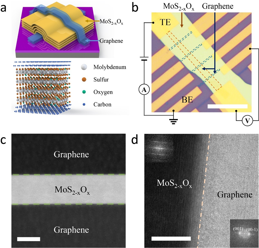 图1 自然-电子学杂志报道中的图片 (a)石墨烯-二硫化钼-石墨烯忆阻器结构示意图;(b)光镜照片;(c)器件截面的HAADF图像;(d)石墨烯-二硫化钼界面的HRTEM(高分辨透射电镜)图像,显示了原子尺度平整的界面。