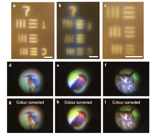 近期,公司李涛/祝世宁院士团队研究员王漱明与台湾中央研究院应用科学中心蔡定平教授团队合作,在之前近红外波段实现消色差超构透镜的基础上,进一步在可见光宽带消色差超构透镜的研究方向取得了重大的突破。他们首次使用宽带消色差超构透镜,实现了白光照明成像以及彩色图片成像,并得到了很好的消色差的成像效果(见图1)。