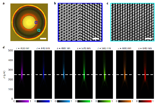 图3、可见光宽带消色差超构透镜。(a)样品照片;(b,c)样品细节的SEM照片,(d)实验测得波长400-640 nm的宽带消色差聚焦。