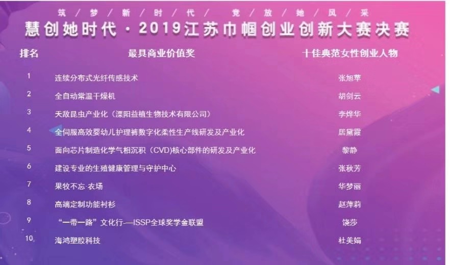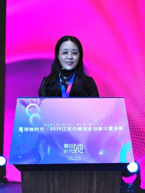 2019年9月29日,由江苏省妇联联合省人才办、省科技厅、省教育厅、省工信厅、省人社厅、省农业农村厅等单位主办的以服务女性创业者为主的专业赛事“慧创她时代”2019江苏巾帼创业创新大赛决赛暨颁奖典礼在南京金陵江滨酒店举行。 江苏省副省长、省巾帼建功活动领导小组组长马秋林出席并讲话,江苏省妇联党组书记、主席张彤主持颁奖仪式。江苏省委组织部副部长洪浩,省委教育工委副书记苏春海,省科技厅副厅长夏冰,省工业和信息化厅副厅长李强,省人力资源和社会保障厅副厅长张宏伟,省农业农村厅副厅长蔡恒等领导和嘉宾出席。