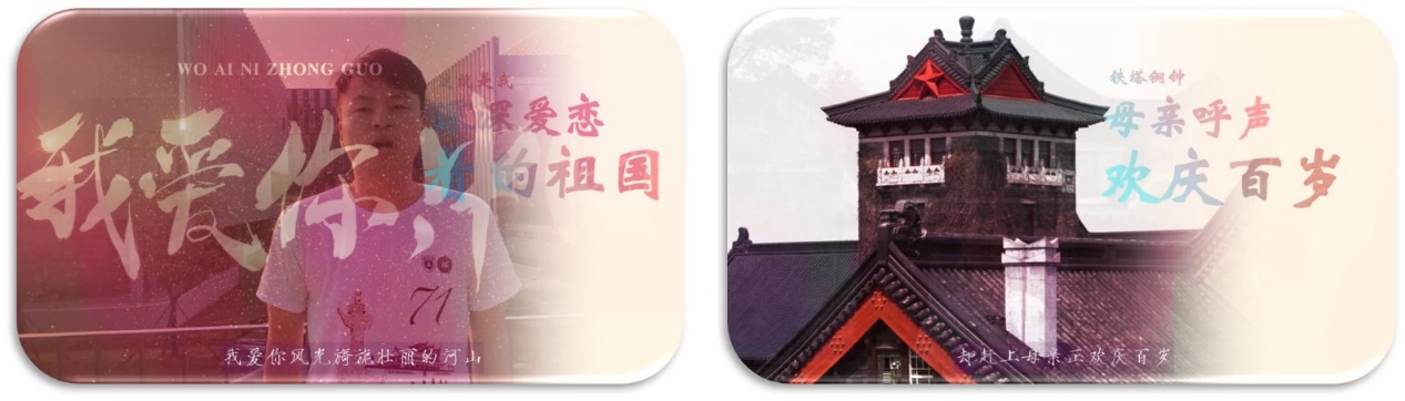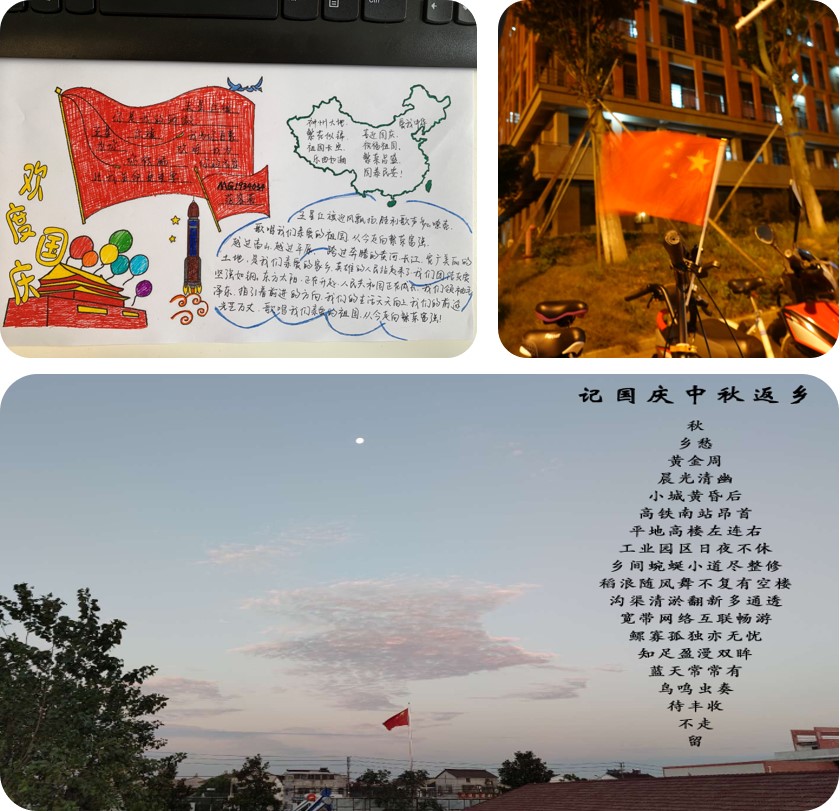 范容莉同学用手抄报的形式表达了自己对祖国的热爱,用歌词来记录祖国的美好瞬间。林沛城同学在学校的校道上偶然发现一面国旗,他捡起来插在路边一辆电车上,艳红国旗在灿黄路灯下随风飘扬。随着祖国日益富强,南大校园从老鼓楼校区扩建至仙林大规模校区,员工与教职工的生活水平亦逐步得到改善,电车作为一种校内代步工具,使用者数量逐渐增大,即为国民经济水平、消费能力提升的一方面体现。孙训同学利用假期时间回到家乡,看到家乡发生了很大变化:乡路修补、废弃屋宅清理、水渠修缮、宽带入户等。老有所依幼有所养,黄发垂髫并怡然自乐,而这不是陶公想象中的桃花源,只是我们伟大祖国现实中一个平凡的小农村。孙训同学有感而发,作令一首。