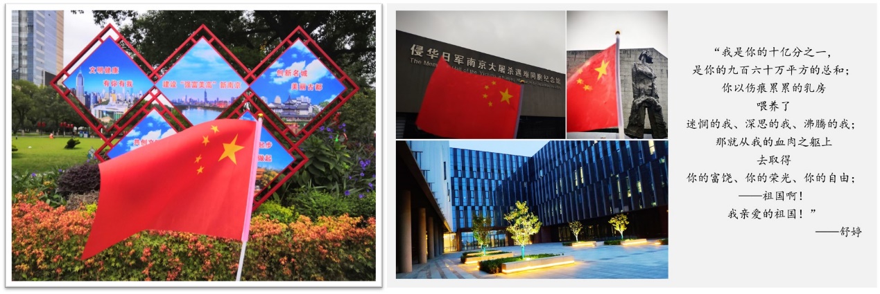 姜贺阳同学拍摄了国旗与社区宣传牌的合影,其中南京市政府提出“创新名城美丽古都”的城市发展愿景就在宣传牌中,这体现了南京市已经把重视创新人才提高到城市定位的高度,在未来南京市必将会具有更高的国内知名度和影响力。马宁宁同学拍摄的侵华日军南京大屠杀遇难同胞纪念馆与国旗合影。鲜红的旗帜与黑白的背景形成强烈对比,仿佛在对沉痛的历史进行哀悼。在举国欢庆的时刻我们也不能忘记历史的惨痛教训,牢记吾辈之使命,振兴中华之崛起!