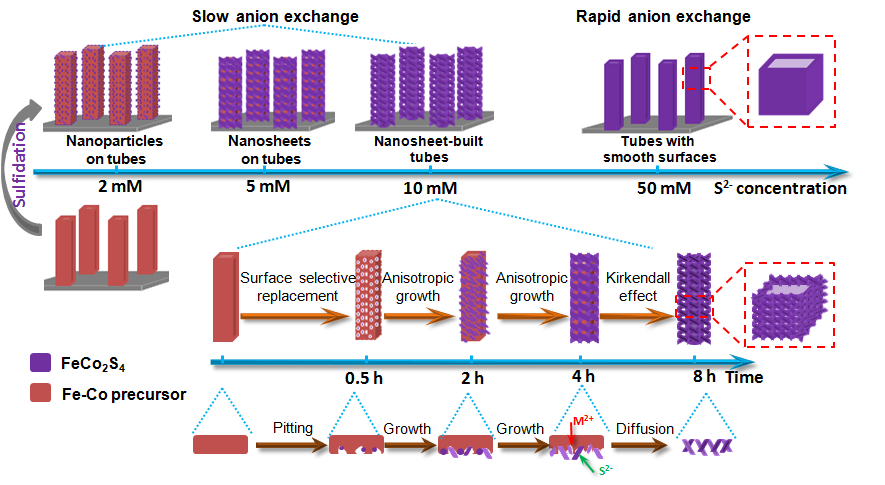 图1.从控制硫化反应动力学的角度出发,通过精确控制阴离子交换(硫化反应)速率和时间,形成由相互交叉FeCo2S4纳米片构建的正方形截面形貌的多孔壳微米管阵列的过程示意图