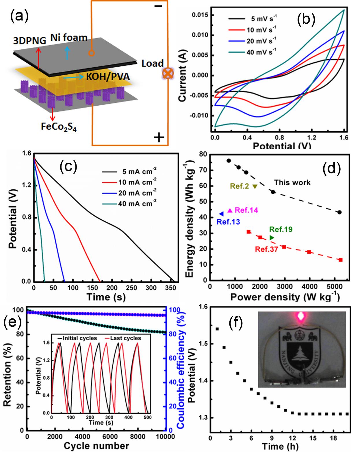 基于以上优点,制备的FeCo2S4电极在5 mA cm-2电流密度下比电容达到了2411 F g-1,在50 mA cm-2下仍可达1742 F g-1;经过5000次充放电循环后,比电容保持率高达92.2%,特别是后2000次循环仅有1.2%的电容损失;在50 mA cm-2高电流密度下比电容仍可达到1472 F g-1。这些性能均高于相同条件下其它单一双金属硫化物纳米管阵列电极。研究人员采用三维掺氮石墨烯薄膜为负极、固态凝胶电解质作为隔膜,组装得到了非对称型全固态超级电容器(图2)。在功率密度755 W Kg-1下能量密度达到76 Wh Kg-1,高于文献报道的其它相似的固态器件;在10 mA cm-2的高电流密度下循环10000次后器件的电容保持率为82%,库仑效率高达95.6%。
