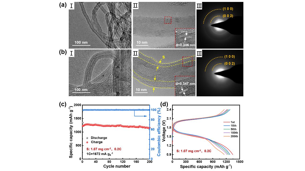 图2. 复合固态硫正极表征和基于锂铝合金负极的全固态锂-硫电池的电化学性能。(a)MWCNTs和(b)S@CNTs的透射电子显微镜图(I和Ⅱ)及对应的电子衍射图(Ⅲ);全固态锂-硫电池在0.2C下的(c)循环稳定性测试图和(d)对应的第1、10、50、100、200圈的充放电曲线图。