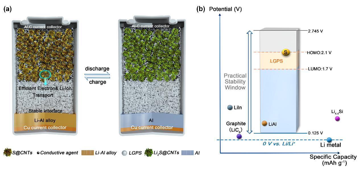图1. (a)以锂铝合金为负极的全固态锂-硫电池示意图和其工作原理;(b)硫化物固态电解质LGPS的实际电化学窗口示意图和不同电极材料的工作电位。