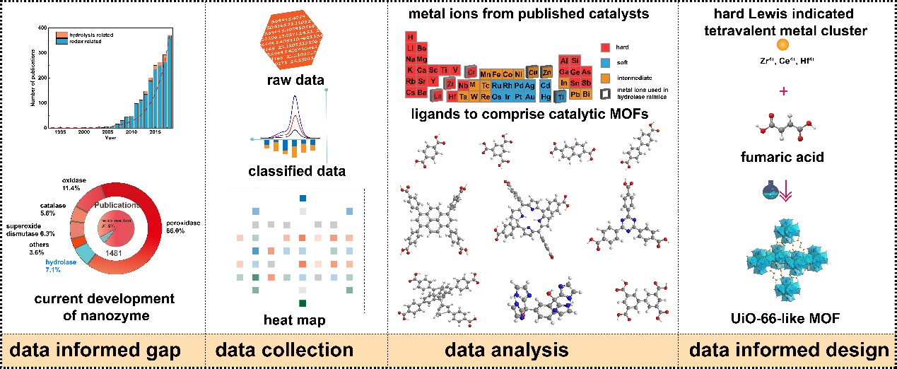 在国家、江苏省、betway88西汉姆联等项目的资助下,betway88西汉姆联魏辉研究组与合作者在水解型纳米酶的设计及应用等方面取得了突破进展。继此前基于Sabatier催化原理所提出的eg电子占据数来指导理性设计类过氧化物酶纳米酶(Nat. Commun., 2019, 10, 704);以及基于Hammett线性构效关系设计的高活性类氧化酶纳米酶(Adv. Mater., 2021, 33, 2005024),魏辉研究组继续报道以数据启示为策略,得到的高性能水解型纳米酶(Data-informed discovery of hydrolytic nanozymes)。该论文发表在《自然-通讯》上(Nat. Commun., 2022, 13, 827)。