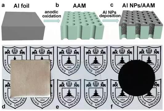 图1:三维铝颗粒等离激元黑体自组装工艺与组装前后光学照片对比图