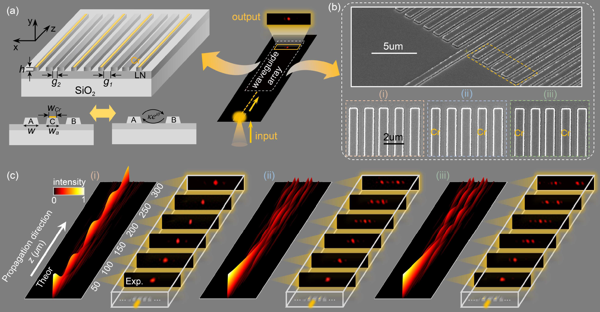 为了实验验证这种敏感的拓扑态,研究人员首先进行了细致的全耦合设计,即通过在两根主波导之间引入带有损耗和失谐的辅助波导(图2(a)),这种耦合设计方案可以在理论和实验上得到两主波导之间有效耦合为正数、负数、虚数(即耗散耦合),以及一般的复数耦合。在此基础上,研究人员基于薄膜铌酸锂平台设计了多组不同参数的波导阵列,通过对辅助波导上覆盖Cr条以及改变其宽度引入所需要的损耗和失谐量。在实验中,通过将1550 nm波长的激光耦合输入到阵列中间波导,得到输出端的光强信号。可以看到,对于(i)保守拓扑的拓扑态一直能保持在界面处,即光场总是局域在界面;对于(ii)混合拓扑和(iii)耗散拓扑,随着演化距离的增加,光场偏离界面并出现了弥散的行为,与前面的理论分析和仿真结果基本一致。