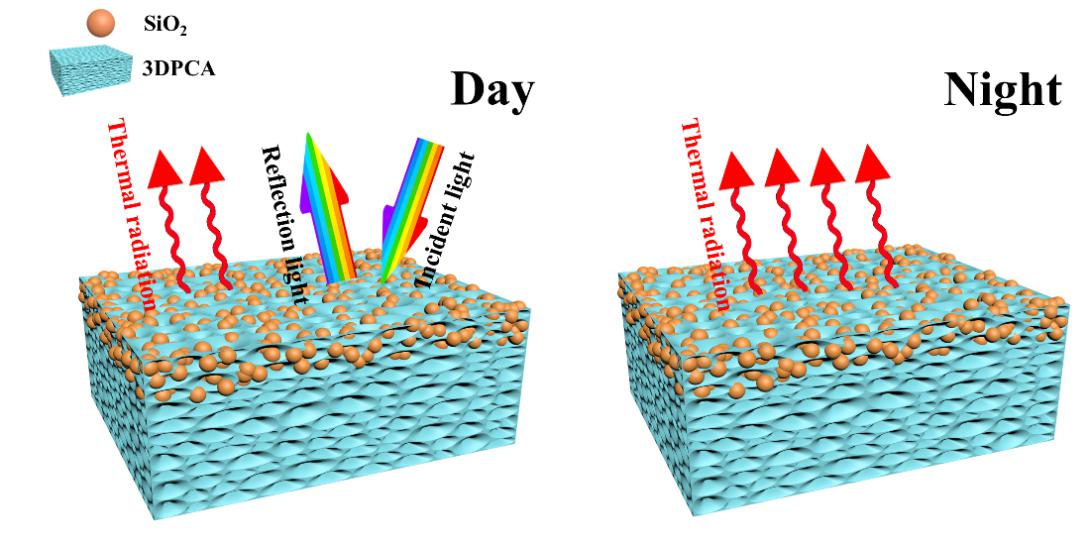 图1. 团队提出的独特三维复合结构及其辐射冷却降温机理示意图。