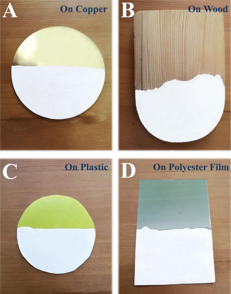 图5. CA/SiO2微球复合纤维膜像涂料一样,能够在不同基体表面沉积 (A) 铜片;(B) 木块;(C) 塑料片;(D) 聚酯纤维板。