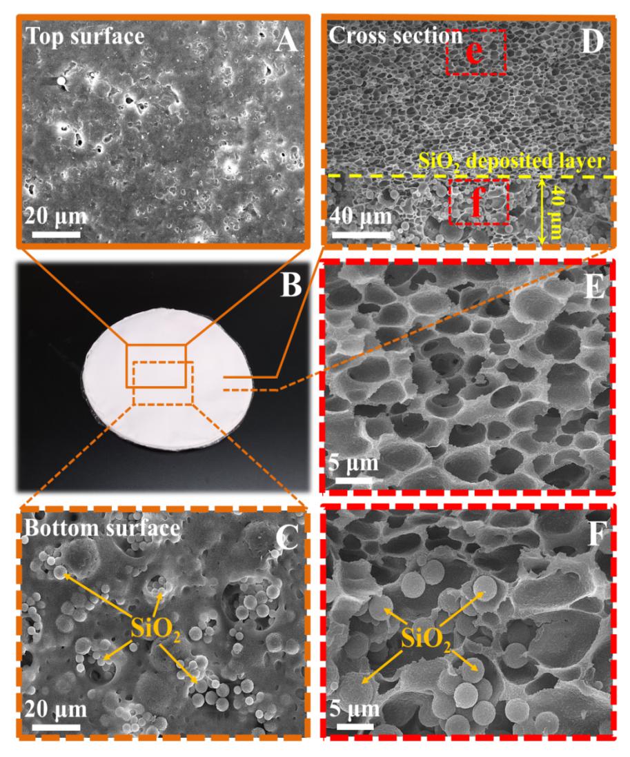 图2. 辐射冷却型复合纤维膜的SEM显微图:(B)纤维膜实物图;(A)纤维膜顶部;(C)纤维膜底面;(D)纤维膜截面;(E)、靠近顶部的截面;(F)靠近底面的截面。