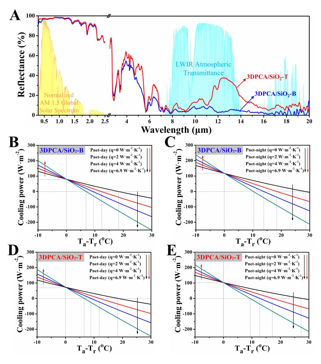 图3. CA/SiO2微球复合纤维膜的光学性能和理论降温功率:(A)反射光谱图;(B-C)SiO2富集面的理论降温功率;(D-E)纤维膜另一面的理论降温功率(白天和夜间)。