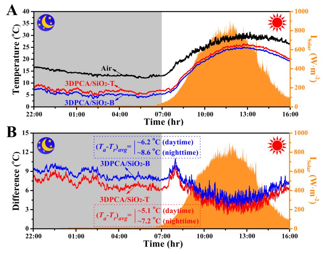 由于独特的三维结构,该复合纤维膜呈现出优异的光学性能,如图3A所示。微米尺度的三维孔结构使纤维膜两侧的太阳光反射率均高达96~97%,且SiO2微球的单面定向富集,有效提升了复合纤维膜的红外发射率(高达95%),远高于未富积SiO2微球的一面(83%)。特别是太阳光反射率高于当前国际最新报道值,达到国际领先水平。基于反射光谱数据,研究团队进一步开展了理论降温功率计算,在不考虑非辐射传热(即不含热传导和热对流)影响的前提下,夜间的理论降温值高达~28 ºC,白天太阳光照下的理论降温值高达~18 ºC(图3B-F)。即使将高达6.9 W·m-2·K-1的非辐射传热系数考虑在内,夜间和白天的理论降温功率也分别高达~11 ºC和~7 ºC。通过户外试验,再次验证了复合纤维膜优异的辐射降温性能。从图4可以看出,纤维膜在夜间可获得~8 ºC的降温效果,即使在白天光功率值高达900 W·m-2的强烈太阳光照下,也能达到6.2 ºC的降温效果。