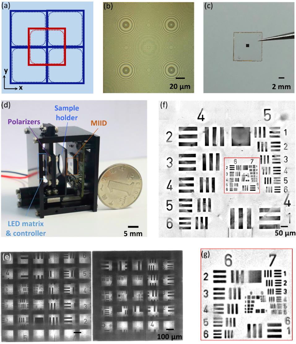 本工作提出的超构透镜集成的成像器件(MIID)将超构透镜直接集成在图像传感器上组成结构紧凑的成像器件。在不增加工作距离的情况下(~500 um),利用超构透镜的灵活设计,采用偏振复用的相位设计,组成6×6透镜阵列构成的毫米量级的非晶硅超构透镜(每个透镜尺寸为200微米)。随着加工技术进步,该超构透镜阵列有望进一步扩展到整个CMOS传感器的厘米尺寸。研究人员进一步将该MIID与LED照明光源、偏振片等元件整合组装出一个高度集成的显微成像系统原型机,尺寸为3.5×3×2.5 cm3(见图2(d))。