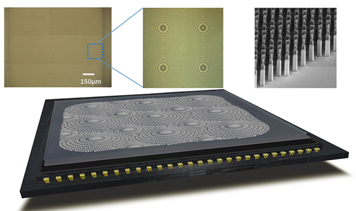 图1、超构透镜阵列集成CMOS成像芯片示意图及样品照片。