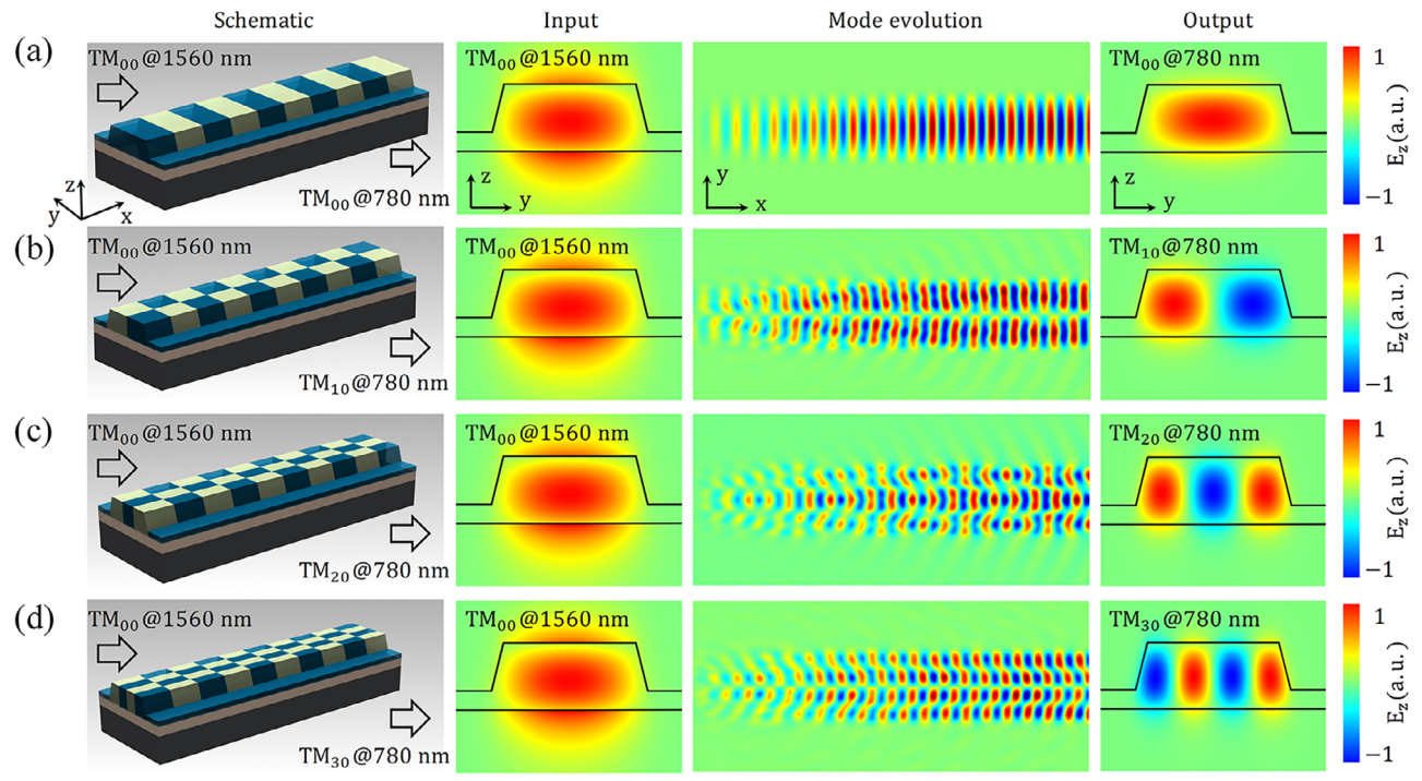 图2 具有二维铁电畴结构的TFLN波导和二次谐波产生过程中基波TM00模式到(a) TM00, (b) TM10, (c) TM20, (d) TM30的光场演化过程示意图。
