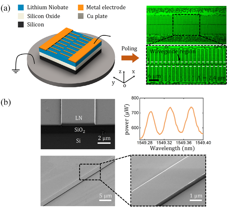 图3 (a) Z-cut TFLN高压电场极化装置示意图和二维铁电畴结构的倍频共聚焦显微图。(b) 制备的TFLN波导的SEM图像和F-P干涉法所得到的干涉曲线。