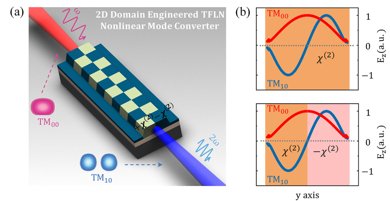 然而,实现波导横向空间模式之间的高效非线性频率转换仍面临关键挑战。与基模间的非线性频率转换不同,当基模与高阶模式非线性相互作用时,不仅需要满足相位匹配条件,波导模式间的非线性交叠积分同样至关重要。例如,在二阶非线性波导中,由于一阶模式电场的反对称分布会导致非线性交叠积分接近于0,基模与一阶模式通常难以产生高效的非线性模式转换。为解决这一问题,近年来,在新兴的TFLN集成光子平台上,人们尝试了多种方案。例如,异质集成线性覆盖层、堆叠180°自发反平行极化铌酸锂薄膜,以及在商用X-cut薄膜铌酸锂上采用分层极化等技术。这些方案通过打破二次谐波TE01电场分布的反对称性来提高非线性交叠积分,并通过模式相位匹配来实现基膜和一阶模的倍频转换。然而,以上方案需要对波导模式色散进行精确调控以实现相位匹配,技术上也难以实现任意波导横模之间的非线性频率转换。