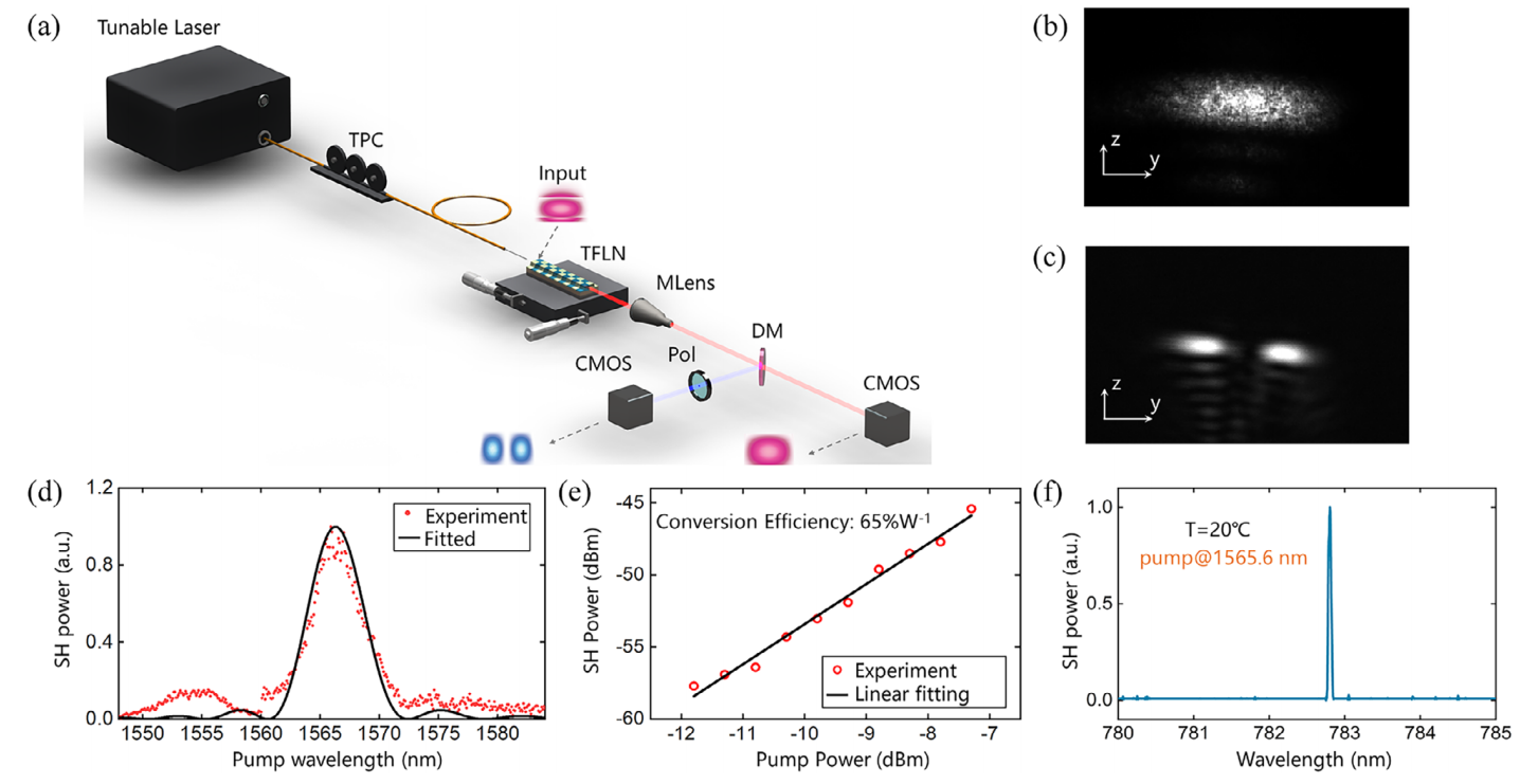 图4 (a) 波导模式非线性转换实验装置示意图。(b),(c) 实验中基波和二次谐波波导模式图像。(d) 测量得到的二次谐波产生的波长调谐曲线。(e) 二次谐波功率与基波功率变化关系。(f) 在温度T=20℃时固定基波光波长为1565.6 nm的二次谐波频谱。