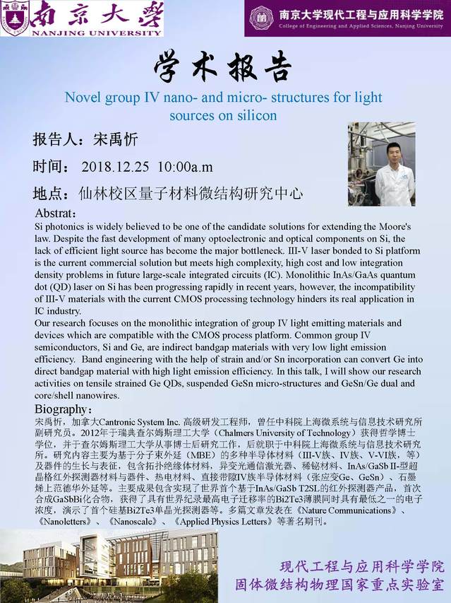 12月25日加拿大高级研发工程师宋禹忻学术报告