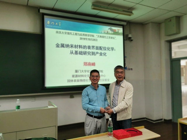 2019年10月25日下午两点,“天地现代工学讲坛”第十二期第三讲在仙林校区仙Ⅰ-204教室顺利举行,本次讲坛我们邀请厦门大学能源材料协同创新中心副主任郑南峰教授担任主讲嘉宾。郑南峰教授以“金属纳米材料的表界面配位化学:从基础研究到产业化”为题,向公司师生带来了一场十分精彩的报告。本次报告由公司能源科学与工程系何平教授主持,臧文成书记代表学院向郑南峰教授赠送讲坛纪念品并合影留念,公司多位教授出席讲坛。