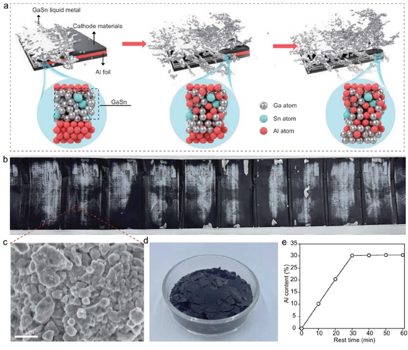 针对上述挑战,研究团队提出利用镓锡液态金属在室温下对铝箔进行选择性解构。研究发现,该液态金属接触铝箔后,可破坏铝表面的氧化层,并沿晶界快速渗透,削弱铝原子之间的金属键连接,使铝箔在较短时间内发生碎裂与瓦解,而负载其上的正极活性材料则能够完整脱附。整个过程无需高温煅烧,也无需酸碱浸出,体现出较好的绿色回收潜力。该室温分离过程及其工作示意如图1所示。