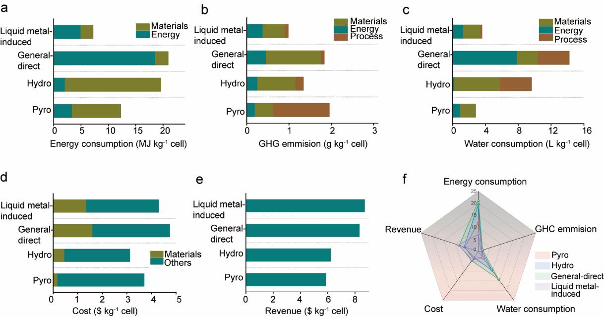 技术经济分析表明,该液态金属回收路线在能耗、用水量、温室气体排放以及综合成本等方面均表现出明显优势。与传统回收工艺相比,该方法能耗更低、流程更简,并兼具材料回收与副产氢的潜力,显示出面向大规模废旧锂离子电池绿色回收应用的可行性。相关综合技术经济分析结果见图3。
