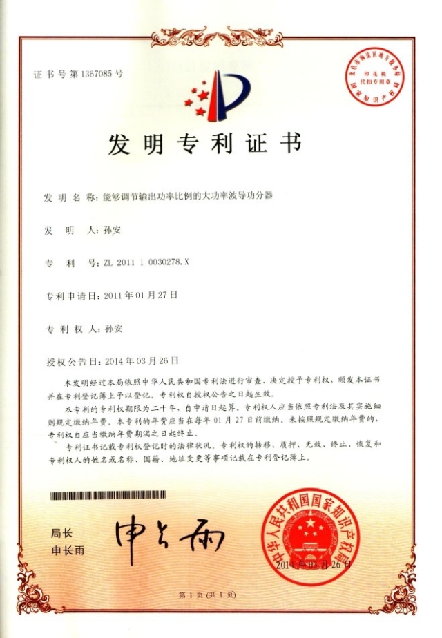 本次获奖专利主要发明了一种能够连续调节输出功率比例的大功率波导功分器。与现有的功分器技术相比,本发明的创新点为: