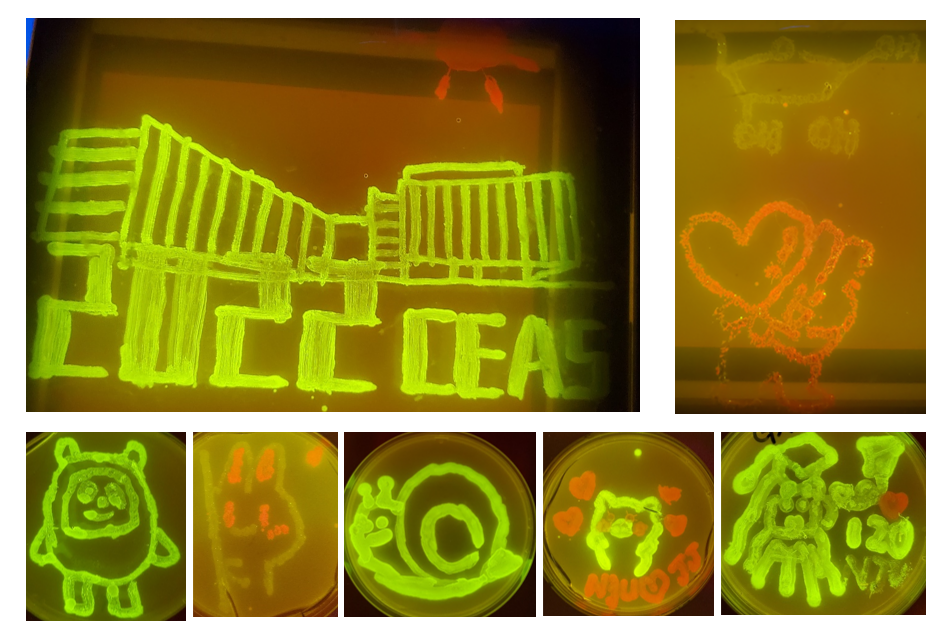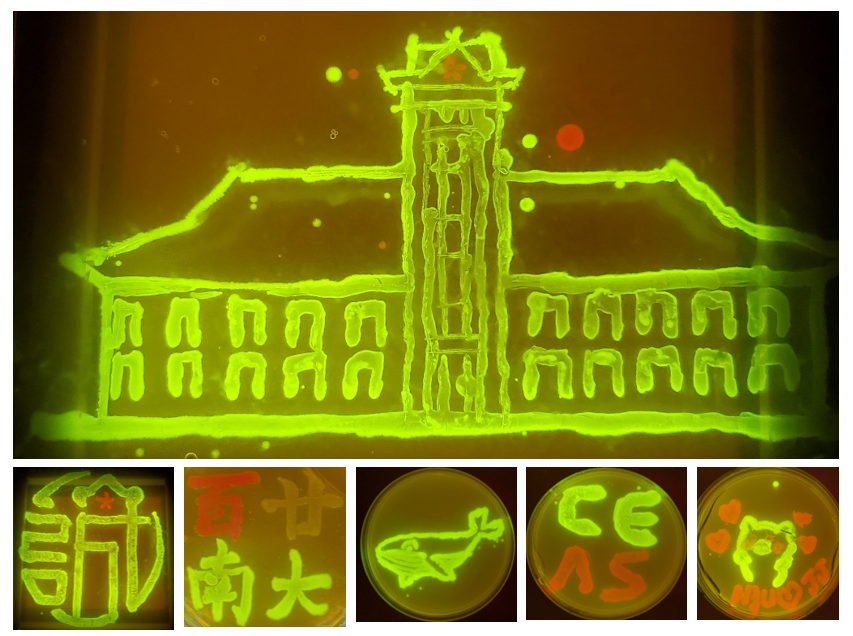 颜料是荧光工程菌,画板是微生物培养皿,画笔是接种环。转导了红色荧光蛋白RFP、绿色荧光蛋白GFP,以及黄色荧光蛋白YFP的大肠杆菌提供了红绿黄三种绚丽的色彩。betway88西汉姆联的党员师生们随性提笔,书所思所想,灼灼青春,跃然菌上。南大“诚”、北大楼、大蓝鲸、“百廿南大”……一幅幅动人图案中蕴含着betway88西汉姆联师生们对母校的深厚情谊。