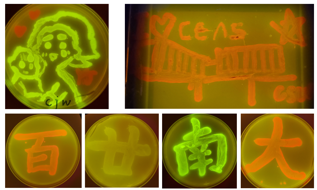 颜料是荧光工程菌,画板是微生物培养皿,画笔是接种环。转导了红色荧光蛋白RFP、绿色荧光蛋白GFP,以及黄色荧光蛋白YFP的大肠杆菌提供了红绿黄三种绚丽的色彩。betway88西汉姆联的党员师生们随性提笔,书所思所想,灼灼青春,跃然菌上。南大“诚”、北大楼、大蓝鲸、“百廿南大”……一幅幅动人图案中蕴含着betway88西汉姆联师生们对母校的深厚情谊。
