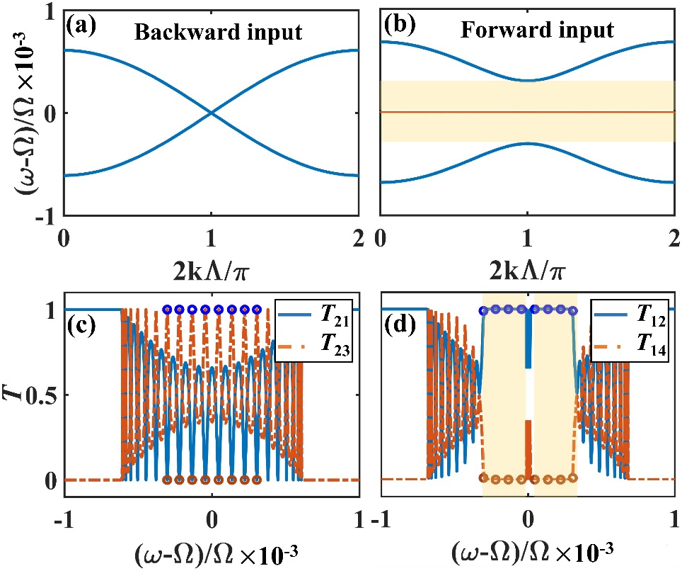图3 (a, b)非互易单光子带隙,其中(a)对应反向激发,(b)对应正向激发;(c, d) 非互易透射谱。