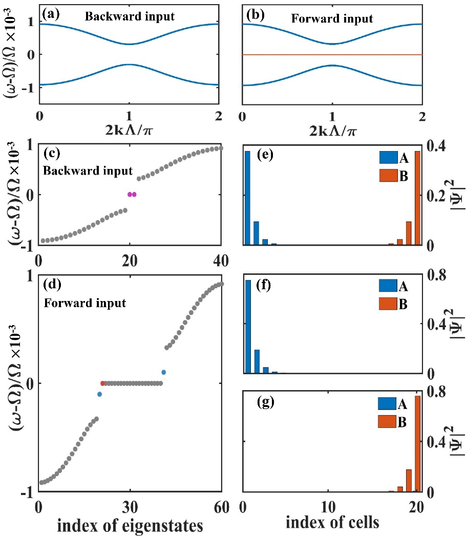 图2 (a, b) 非互易能带结构,其中(a)对应反向激发,(b)对应正向激发;(c, d)非互易能谱,其中(c)对应反向激发,(d)对应正向激发;(e-g)边界态元胞概率分布,其中(e)对应反向激发,(d, e)对应正向激发。