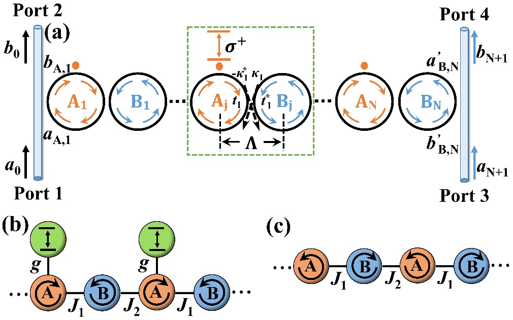 图1 (a) 手性QE-CROW系统示意图。箭头表示对于1或3端口输入(正向入射)的回音壁模式传播方向。2或4端口输入(反向入射)激发相反的传播模式。具有极化跃迁的QEs周期性耦合A子晶格的顺时针模式。(b) 正向入射情况下表现L型三聚体链特征。(c) 反向入射情况下表现二聚体链特征。