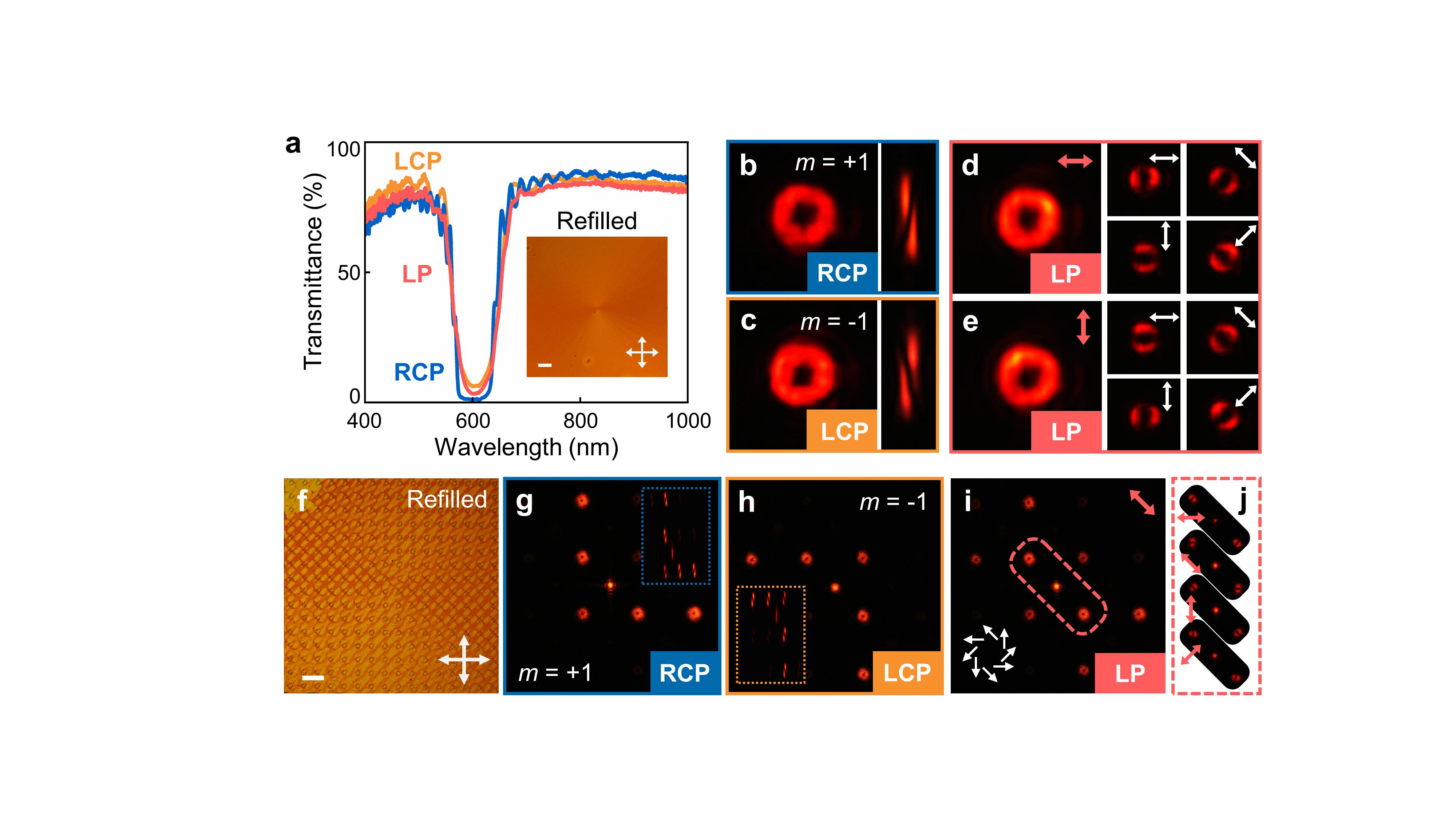 图3.双手性共存液晶几何相位超结构的表征测试及光场调控