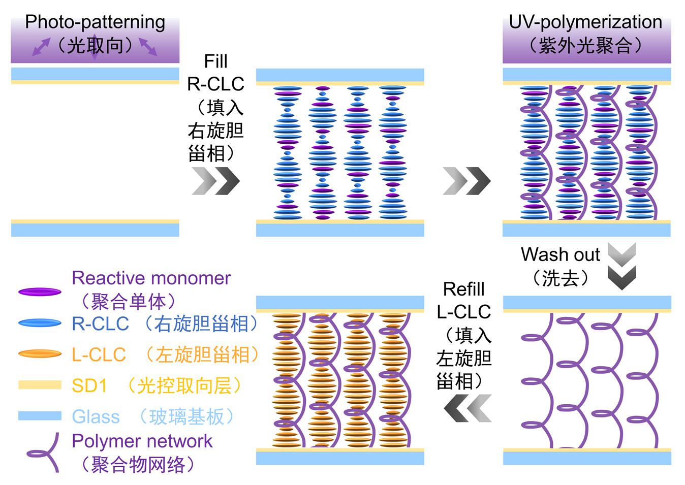 图2. 双手性共存液晶几何相位超结构的制备流程示意图