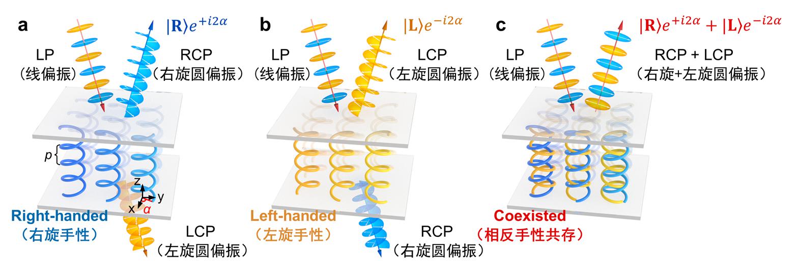 液晶兼具液体的流动性和晶体的各向异性,广泛应用于生产生活中。手性液晶独特的多层级各向异性、可控自组装及多元灵敏响应性,带来丰富的微纳光学效应,为几何相位另辟蹊径。2016年,多国科学家同时在手性液晶中发现了光子自旋-轨道耦合效应,反射光被赋予与螺旋轴排列相关的几何相位,且光子带隙内效率等高。随即引起强烈关注,为宽带高效、功能集成、动态重构的平面光子技术提供了新方案。然而,受限于手性液晶内禀的单手性结构,只有与其旋性相同的圆偏振光才会被反射并携带几何相位,相反圆偏光完全透过且不受调制(图1a-b),大大限制了相关领域的发展和应用。