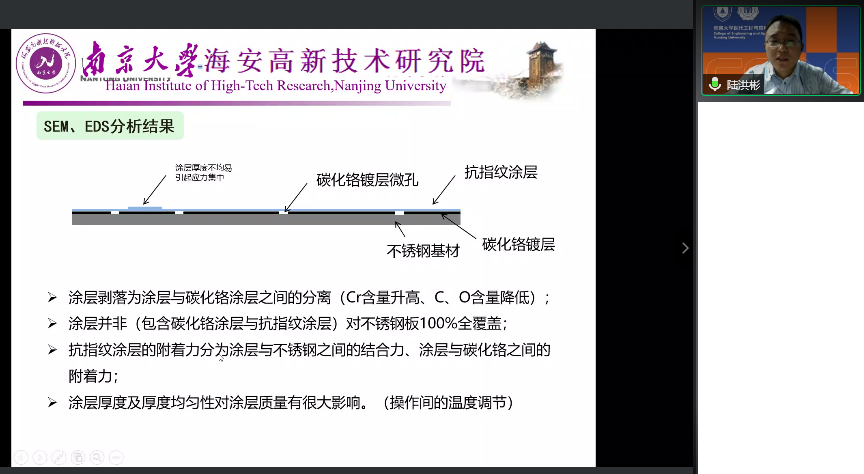 随后,陆博士介绍了自己所做的涂层相关工作,强调金属抗腐蚀性能的提高非常重要。涂层可以起到美观、装饰、防腐蚀的作用,是便捷、经济的处理方法。陆博士介绍了不锈钢的原位聚合有机-无机杂化涂层工作。这种涂层使用少量无机颗粒充当交联剂来提升性能、抵御腐蚀,此外还有耐高温双疏涂层、抗指纹有色透明涂层;而后,陆博士为我们介绍了一次帮助企业解决镀铬不透明表面抗指纹涂层剥落问题,包括判断剥落层,测试找到可以优化的工艺环节,最终帮助企业解决了难题。陆博士有很多出色的研究成果,但是受限于时间,没有一一展开讲述,但是已经使同学们受益匪浅。