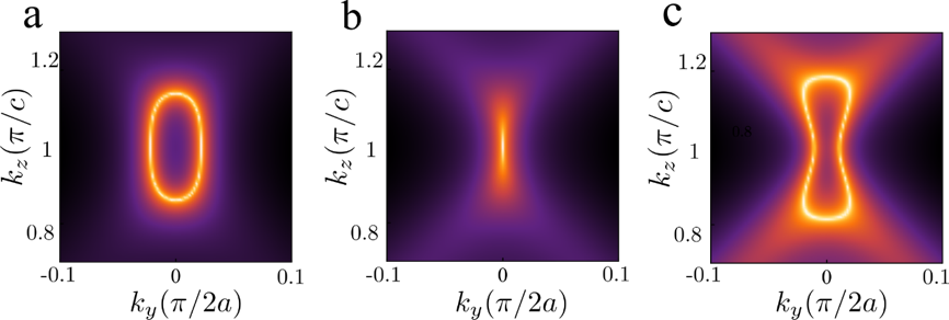 图3. 基于紧束缚模型的表面杂化狄拉克色散等频率面图。(a)频率位于杂化狄拉克点之下,(b)频率位于杂化狄拉克点处,(c)频率位于杂化狄拉克点之上。