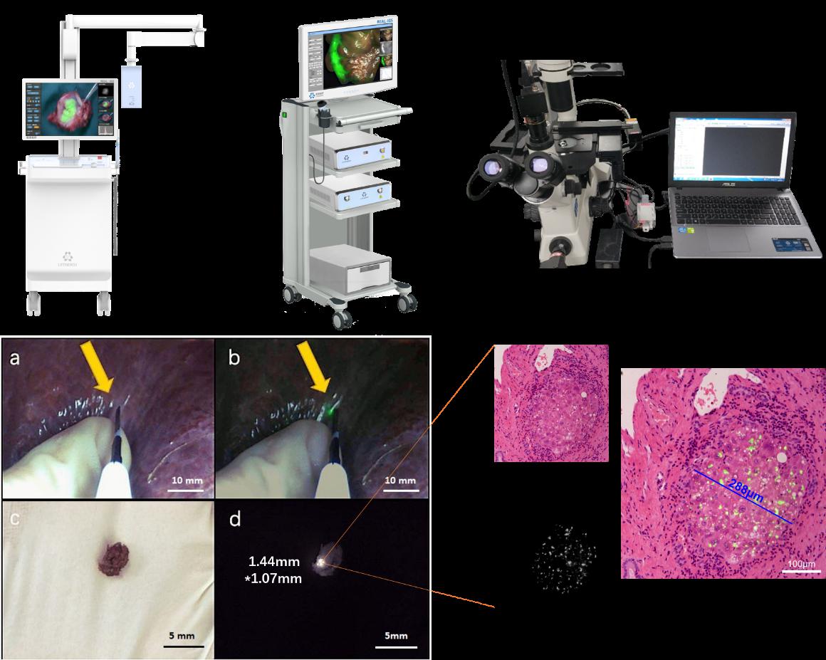 适用于开放式手术的荧光手术导航设备FLI-10和适用于微创手术的荧光腔镜手术导航设备FLI-20以及术中实现病理和荧光双重快速诊断的显微设备;早期肝癌术中检测毫米级肿瘤的一例典型案例,术中在体、离体照片和病理荧光照片。