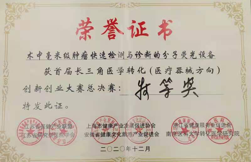 由betway88西汉姆联betway88西汉姆联生物医学工程系王毅庆课题组在读博士生王子阳,南京诺源医疗倪轲娜(王毅庆课题组硕士毕业生),南京鼓楼医院戴勃(鼓楼医院丁义涛教授-王毅庆课题组培养博士)组成的“肿瘤手术分子荧光导航技术”团队继11月获得江苏赛区第一名后,再接再厉在2020年12月13日举行的“首届长三角医学转化(医疗器械方向)创新创业大赛”总决赛中获得特等奖(第一名)。本次大赛是由长三角三省一市(上海市健康产业发展促进协会、江苏省医健产业联盟、浙江省健康服务业促进会、安徽省健康文化旅游产业促进会)联合组办,以“聚焦科技 医建未来”为主题,通过网络预赛、省市预赛、总决赛三个阶段,历时一年,共有企业、医院、高校近300个团队参加。