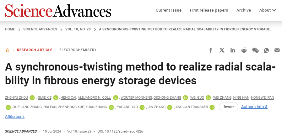 相关工作以题为“A synchronous-twisting method to realize radial scalability in fibrous energy storage devices”发表在综合期刊Science Advances上。文章第一作者:周振宇,谢思杰,蔡恒。文章通讯作者:周振宇,张漩,姚亚刚,张锦,Jan Fransaer。该工作得到了教育部“长江学者奖励计划”等的支持,同时也得到了固体微结构物理国家重点实验室、人工微结构科学与技术协同创新中心以及江苏省功能材料设计原理与应用技术重点实验室的大力支持与帮助。