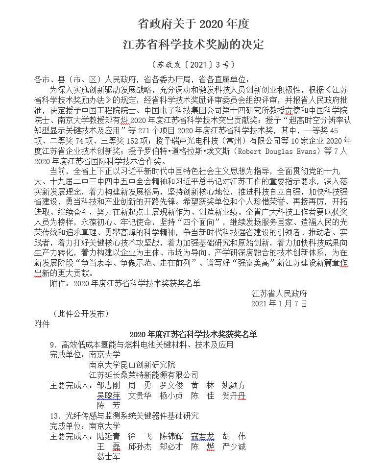 日前,江苏省人民政府发布《省政府关于2020年度江苏省科学技术奖励的决定》,公司共有两项科技成果获2020年度江苏省科技一等奖,分别为邹志刚院士团队“高效低成本氢能与燃料电池关键材料、技术及应用”及陆延青教授团队“光纤传感与监测系统关键器件基础研究”。
