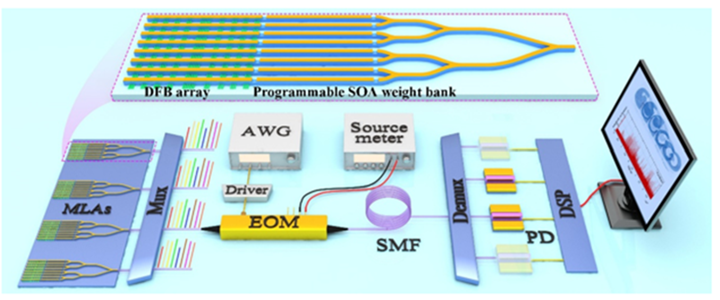 当前的光子卷积处理器遵循电子卷积(如:Nvidia Ampere架构的Tensor Core、华为Davinci架构的CUBE Core等)的技术路径,将张量卷积转换为多通道的通用矩阵乘法运算(GeMM),该多通道数据流的矩阵乘法运算导致数据复制和硬件复杂性,大大增加了计算量和系统成本。此外,较低的权重精度也是光计算的痛点之一,严重影响光子计算系统的实际应用。此项研究报道的单数据流、高权重精度的光子张量卷积处理器,为多通道张量数据提供了一种光学上的单通道卷积方法,大大减小了高速模拟器件的所需数量,为系统实用化与小型化打下基础。此外,与光源直接单片集成的半导体光放大器(SOA)阵列被用作可编程权重库,实现了9.2 bit的权重精度,满足了张量卷积处理(TPU)的8 bit精度要求。